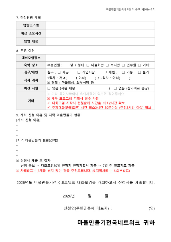 - 첨부파일 : 2026년 마을만들기전국네트워크 대화모임 개최지역 신청공고 v2.1.pdf (182.5K) - 다운로드
