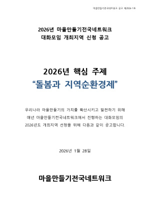 2025년의 다사다난했던 한해가 지나갔습니다.공동체와 사회적경제 영역에서 활동하시는 활동가 분들에게 어느때 보다도 힘들고, 혼란스러웠던 한해가 아니었나 생각됩니다.마을만들기전국네트워크는 새롭게 시작할 2026년 "돌봄과 지역순환경제"를 핵심주제로 대화모임을 진행합니다. 마을만들기전국네트워크와 함께 위안받으며, 고민할 대화모임 개최지역 신청 받습니다.대화모임 운영기간 : 2026년 3월 ~ 11월 (매월 1회)진행일시 : 매월 두번째 금요일 14:00 ~ 토요일 11:50 (1박2일)개최지역 신청마감 : 2026년 2월 10일개최지역 선정 및 공고 : 2026년 2월 20일문의 : maeulsns@gmail.com자세한 내용은 첨부한 공고문을 참고해 주세요.#마을만들기전국네트워크 #마을만들기전국네트워크대화모임 #대화모임 #마을넷 #MNN #마을기본법