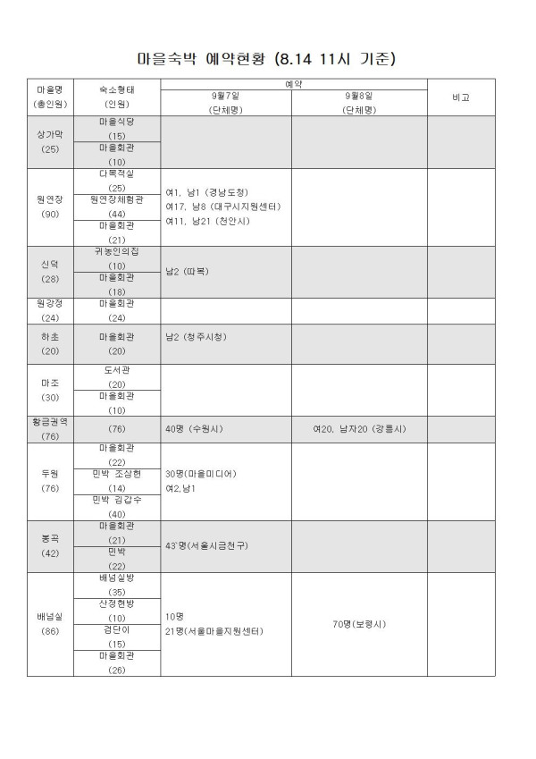 마을숙박예약현황입니다. 마을숙박 신청 전에 참고하시면 좋을 듯 합니다.