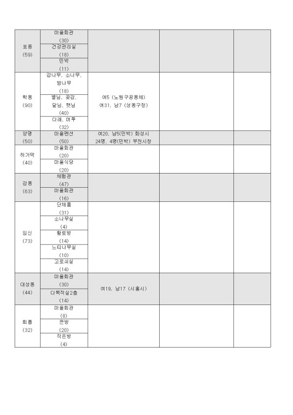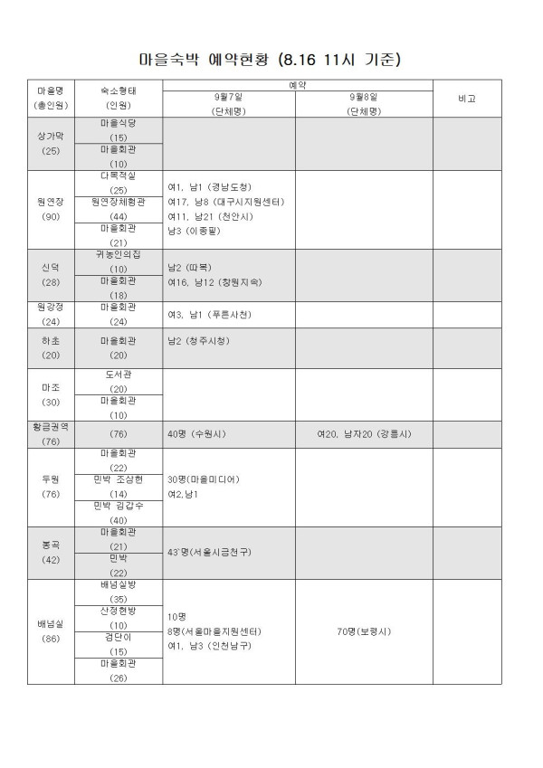 마을숙박예약현황입니다. 마을숙박 신청 전에 참고하시면 좋을 듯 합니다.