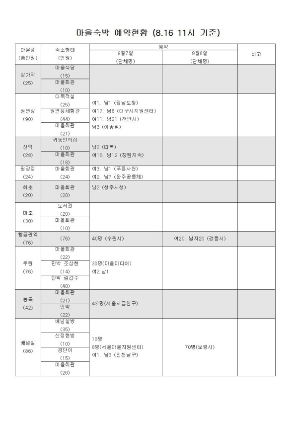 마을숙박예약현황입니다. 마을숙박 신청 전에 참고하시면 좋을 듯 합니다.