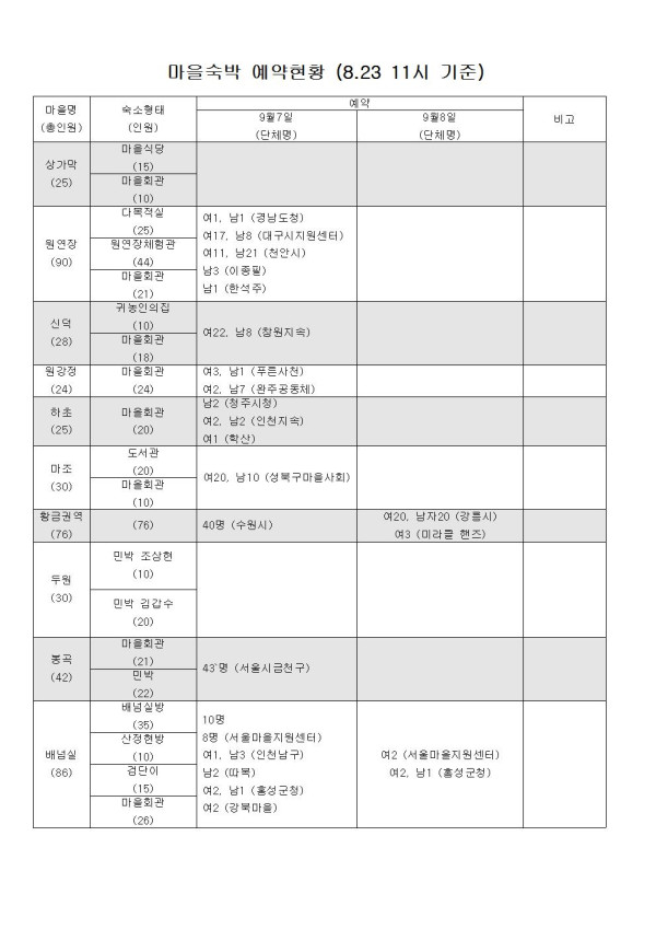 마을숙박예약현황입니다. 마을숙박 신청 전에 참고하시면 좋을 듯 합니다.