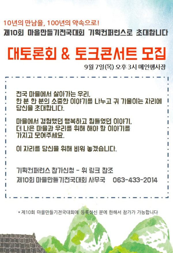 (기획컨퍼런스는 별도의 참가비는 없으며 제10회 마을만들기전국대회에 등록하신 분에 한해서 참가가능합니다.)