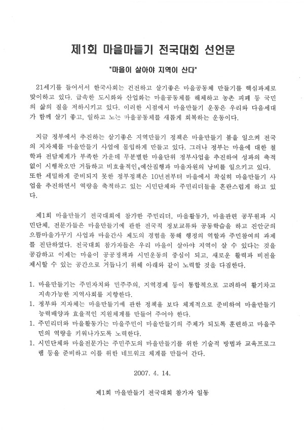 [1회전국대회_2007] 제1회 마을만들기 전국대회 선언문