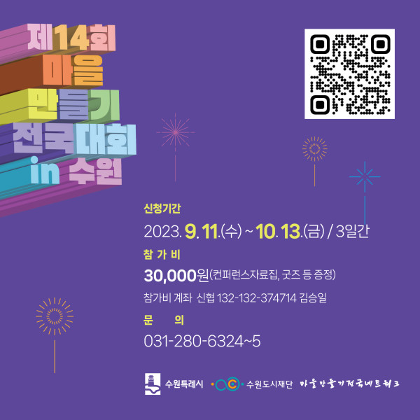 제14회 마을만들기전국대회 in수원의 사무국을 맡고 있는 수원도시재단 마을자치지원센터입니다.
