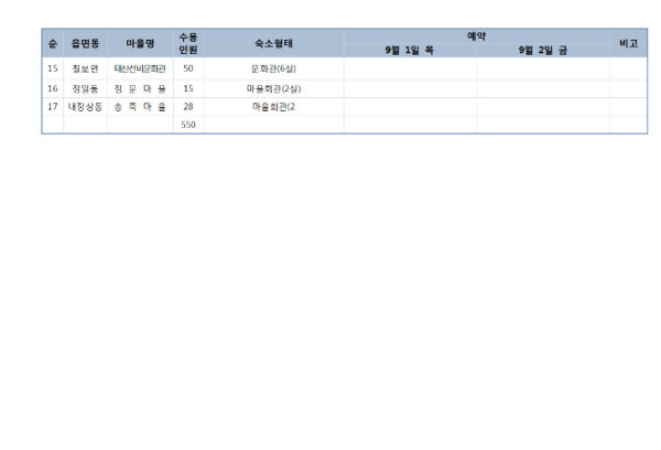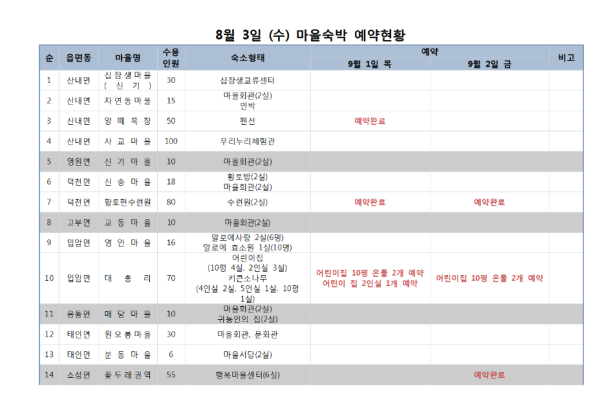 마을숙박의 예약현황을 공유해드립니다. 벌써 마을숙박이 예약이 찬 곳이 있습니다.