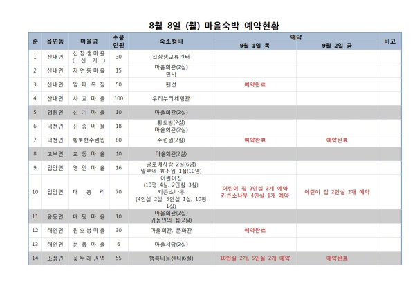 마을숙박의 예약현황을 공유해드립니다. 벌써 마을숙박이 예약이 찬 곳이 있습니다.