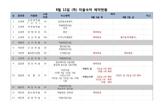 [9회전국대회_2016] 08.11(목) 마을숙박 예약현황(확인필!)