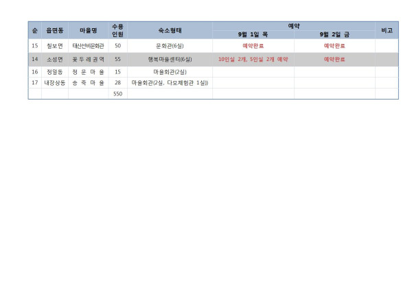 마을숙박의 예약현황을 공유해드립니다. 벌써 마을숙박이 예약이 찬 곳이 있습니다 정읍의 마을들의 매력을 다들 알아보시고 문의전화가 불이나네요 ~ !!