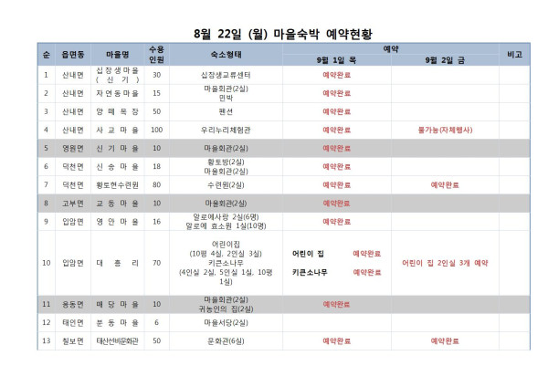 마을숙박의 예약현황을 공유해드립니다. 마을숙박 예약이 거의다 찼습니다.