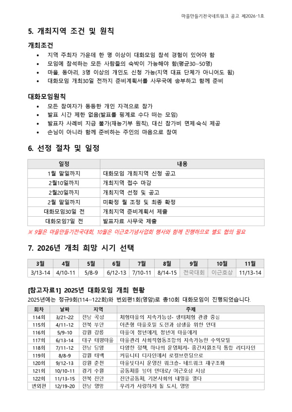 - 첨부파일 : 2026년 마을만들기전국네트워크 대화모임 개최지역 신청공고 v2.1.hwpx (55.8K) - 다운로드