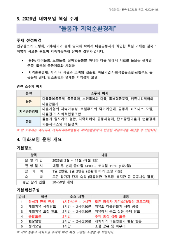 마을만들기전국네트워크는 새롭게 시작할 2026년 "돌봄과 지역순환경제"를 핵심주제로 대화모임을 진행합니다. 마을만들기전국네트워크와 함께 위안받으며, 고민할 대화모임 개최지역 신청 받습니다.