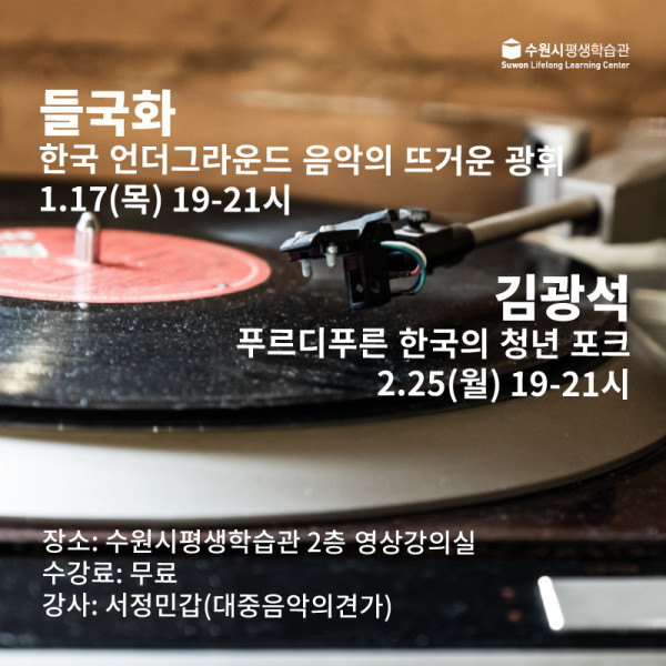 추운 겨울, 전설이 된 뮤지션들의 음악과 전문가 서정민갑 대중음악 의견가의 해설을 통해 몸과 마음을 따뜻하게 녹여보는 건 어떠세요? 월간뮤직, 1월에는 한국 언더그라운드 음악의 뜨거운 광휘 '들국화'가, 2월에는 푸르디푸른 한국의 청년 포크 '김광석'이 찾아갑니다.