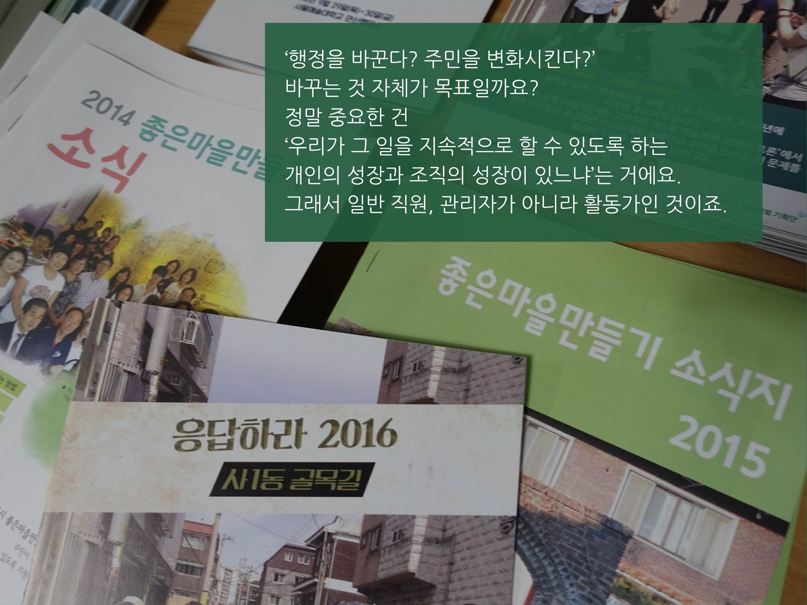 함께 관점을 갖는 겁니다. 흔히 공무원은 영혼이 없다고 하는데 저는 그런 표현은 적절치 않다고 생각합니다. 마을만들기 운동은 영혼이 필요한 일입니다. 센터와 주민, 행정이 비슷한 관점을 갖고 이를 함께 풀 수 있는 효과적인 방법을 지속적으로 개발해야 합니다. 일을 풀어내는 방법에 있어서는 행정과 중간지원조직, 시민사회가 서로 조금씩 다를 수 있어요, 평가의 기준도 다를 수 있고. 서로의 차이는 인정해야겠지만, 마을운동을 왜 하는지, 우리는 어떤 것을 지향하지는 끊임없이 토론해야 합니다. 서로간 변화를 위한 여러 요소가 필요한데, 그 중심엔 진심과 감동이 있다고 생각합니다.