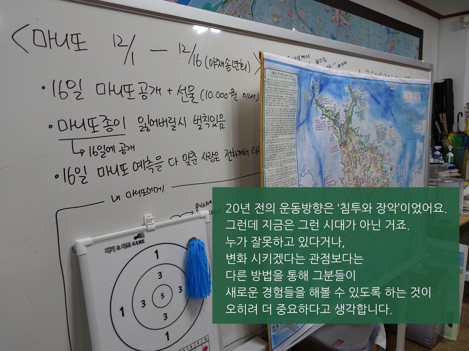 그런데 지금은 그런 시대가 아닌 거죠. 누가 잘못하고 있다거나, 변화를 시켜야 한다고 보지 않고, 오히려 유관기관에 계신 분들을 훌륭하다고 봐야 해요. 이분들이 관점이 어떻든 간에, 또 활동 동기가 어떻든 간에, 어쨌든 자기 시간 내서 하는 분들이기 때문에. 이 분들을 변화 시키겠다는 관점보다는 다른 방법을 통해 그분들이 새로운 경험들을 해볼 수 있도록 하는 것이 오히려 더 중요하다고 생각합니다.