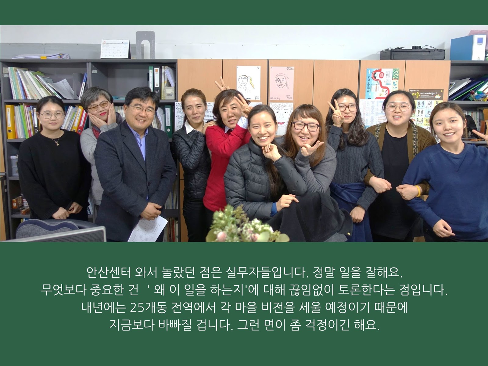 안산센터가 만들어진지 올해가 9년째입니다. 마을운동의 지향점을 가진 시민단체들이 연대해서 만든 센터입니다. 마을의 상상력을 갖고 정말 다양한 실험들을 했습니다. 그 실험 중에 잘된 점들을 모아 현재의 사업구조를 만들었습니다. 마을 일은 벌리면 벌릴수록 늘어나는 특성이 있지요. 안산센터의 확장성은 굉장하다고 생각합니다. 내년에는 25개동 전역에서 각 마을 비전을 세울 예정이기 때문에 지금보다 바빠질 겁니다. 그런 면이 좀 걱정이긴 해요.