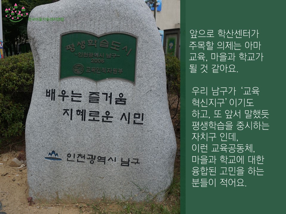 마을과 학교가 어떻게 만나야 하나, 교육공동체에 대한 이야기를 하게 될 것 같습니다. 사실 우리 남구가 교육혁신지구이기도 하고, 앞서 말했듯 평생학습이 중요하기도 한데 이런 교육공동체, 마을과 학교에 대한 융합된 고민을 하는 분들이 적어요. 학교는 지역사회의 자원이고, 아이들은 지역사회의 구성원이니 아이들이 지역에서 북적북적하면서 지역이 활성화 될 수 있도록 아이들이 편하게 학교를 다닐 수 있도록 하는 것이 필요하지 않겠습니까? 말로는 교육혁신지구라고 하지만 사실은 마을도, 학교도 준비가 안된 상황에서 교육청은 일방적으로 학교에 예산만 나눠주고, 학교에서는 프로그램만 하다 끝나는 게 지금 상황입니다. 실제로 아이들이 마을에 애정을 가지고 학교를 다니고, 주민들은 아이들의 성장을 지켜보고, 지원할 수 있도록 해야죠.