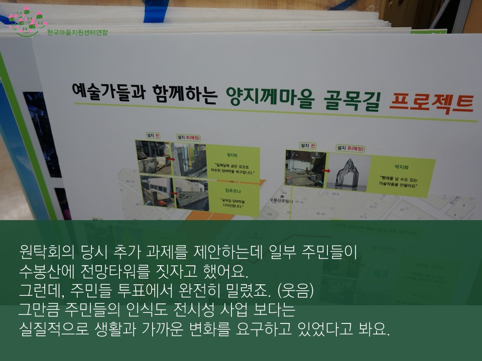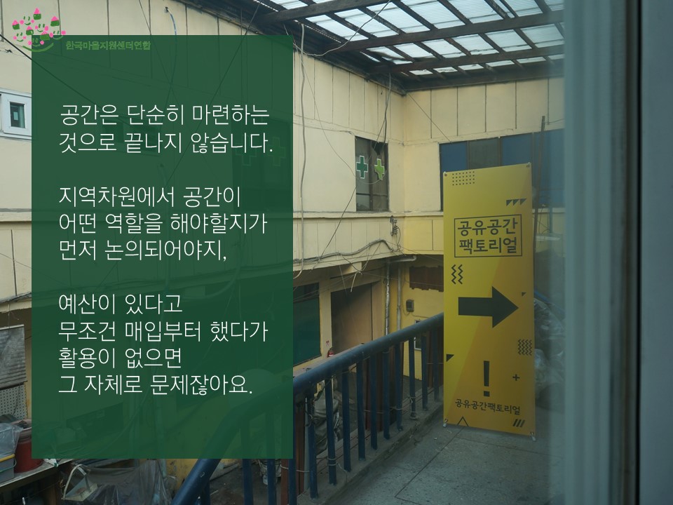 공유자산은 꼭 필요한 문제이지만 우리가 직접 예산을 투자해서 진행하기에는 쉽지 않죠. 그래도 꼭 필요한 부분은 지원을 해주려고 해요. 지금 청년들의 창작 공간 지원으로 그린빌라라고 임대사업을 하는데 문화예술과에서는 또 왜 예술가 지원을 마을팀이 하냐고 하기도 하고. 또 한편으로는 건물을 아예 매입해서 좀더 지속적이고 안정적인 활동을 지원해야 하지 않겠냐는 제안도 있지만 공간은 단순히 마련하는 것으로 끝나지 않습니다. 어떻게 활용할 것인지, 지역차원에서 공간이 어떤 역할을 해야 할 지가 먼저 논의되어야지 예산이 있다고 해서 무조건 매입부터 했다가 활용이 없으면 그 자체로 문제잖아요. 그래서 올해는 우선 운용방안을 마련하고 내년에 매입할 계획을 가지고 있고요.