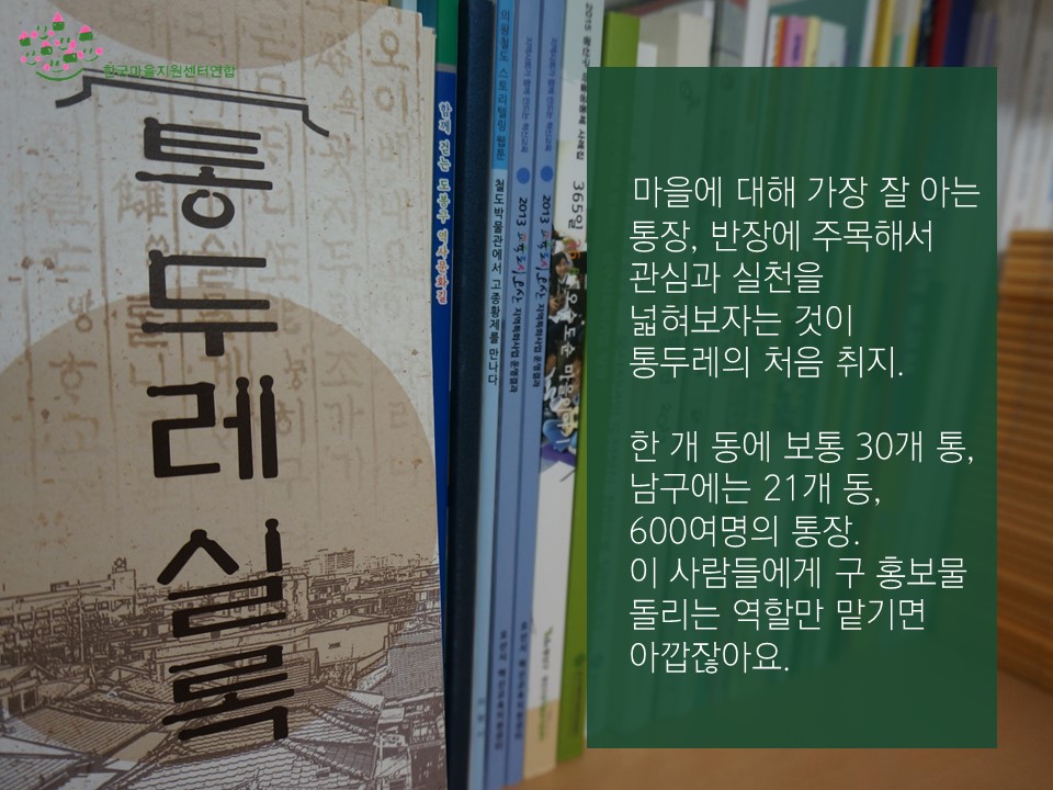 구도심인 남구의 특성상 어르신 세대가 굉장히 많은데 마을에 할 일은 많아요. 그렇다고 시민사회가 활발한 것도 아니고. 이때 누가 활동가 역할을 할 것인가? 마을에 대해 가장 잘 아는 통장, 반장에 주목해서 관심과 실천을 넓혀보자는 게 통두레의 처음 취지였어요. 한 개 동에 보통 30개 통이 있다고 했을 때 남구에는 21개동 600명의 통장이 있는데 이 사람들에게 구 홍보물 돌리기만 맡기면 아깝잖아요.
