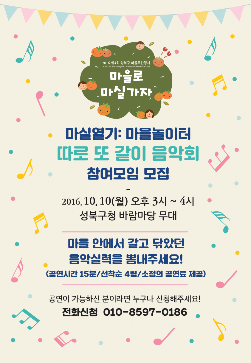 ◎ 성북: [제4회 성북구 마을주간행사] 마실열기: 마을놀이터 따로 또 같이 음악회 참여모임 모집 (10/10)