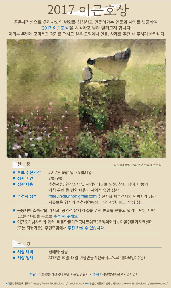 ■ 문의 : 이근호기념사업회 페이스북 페이지 또는 maeulnkeunho@gmail.com